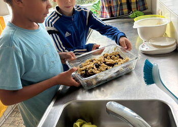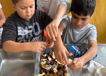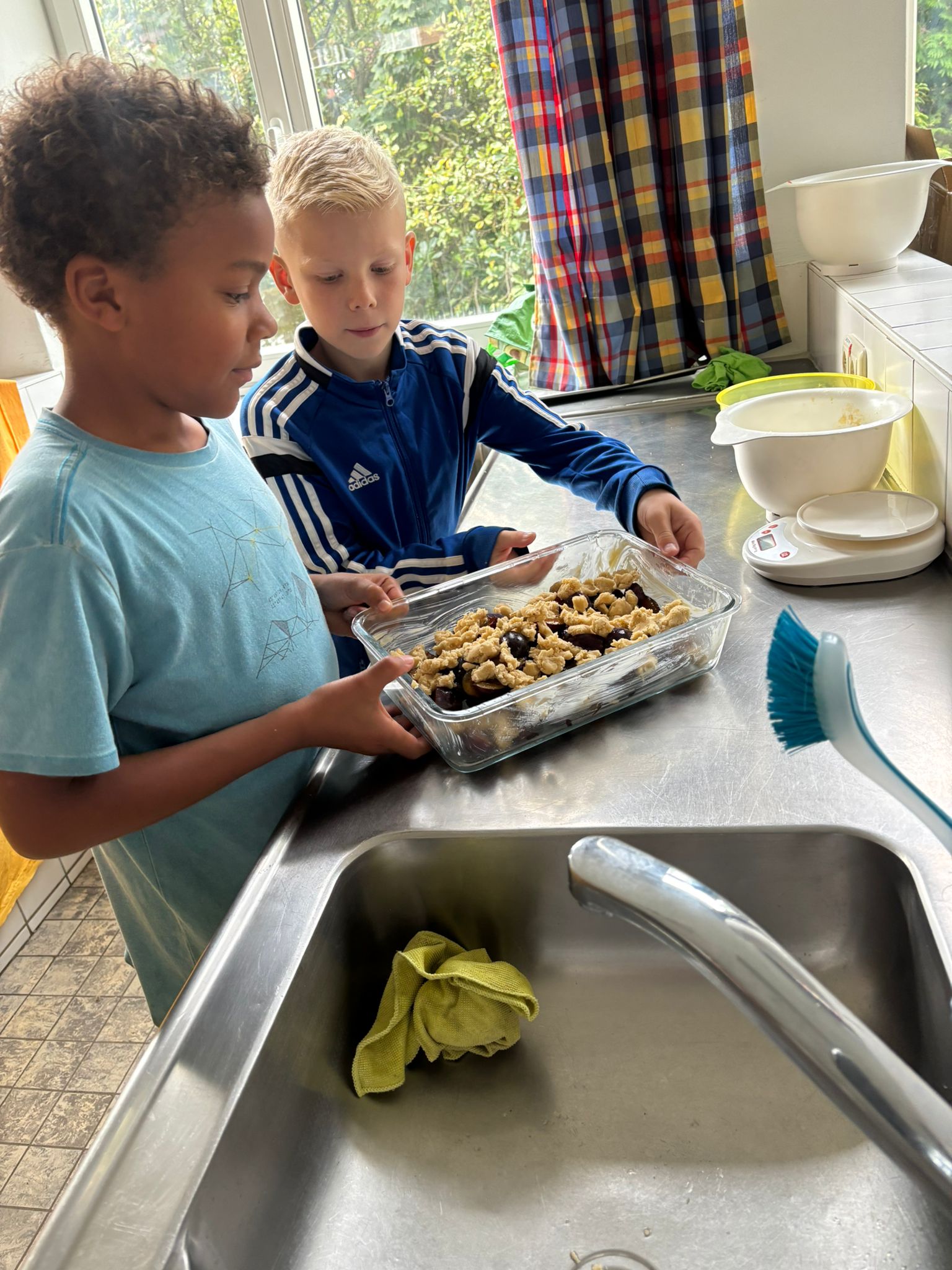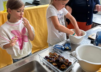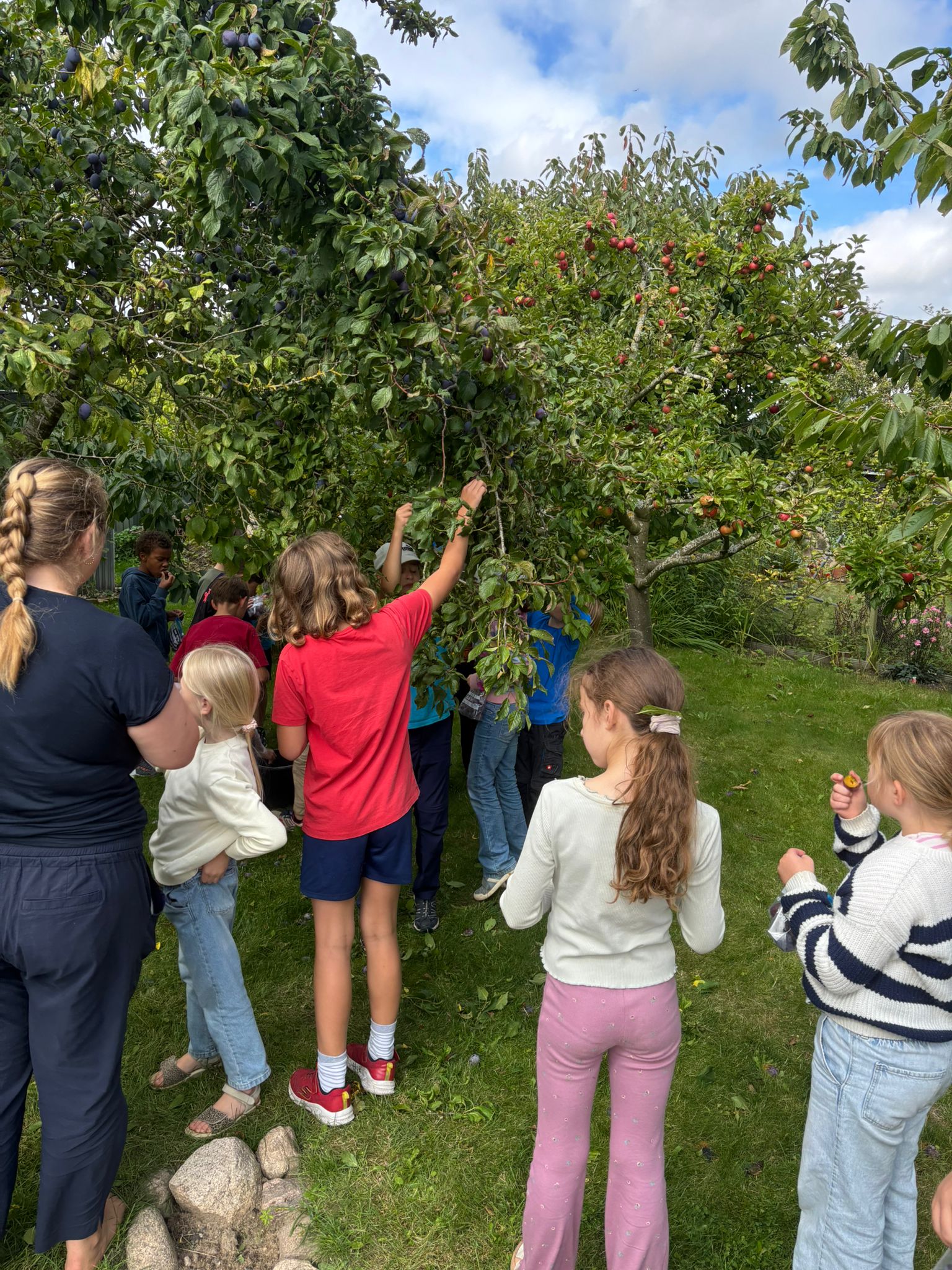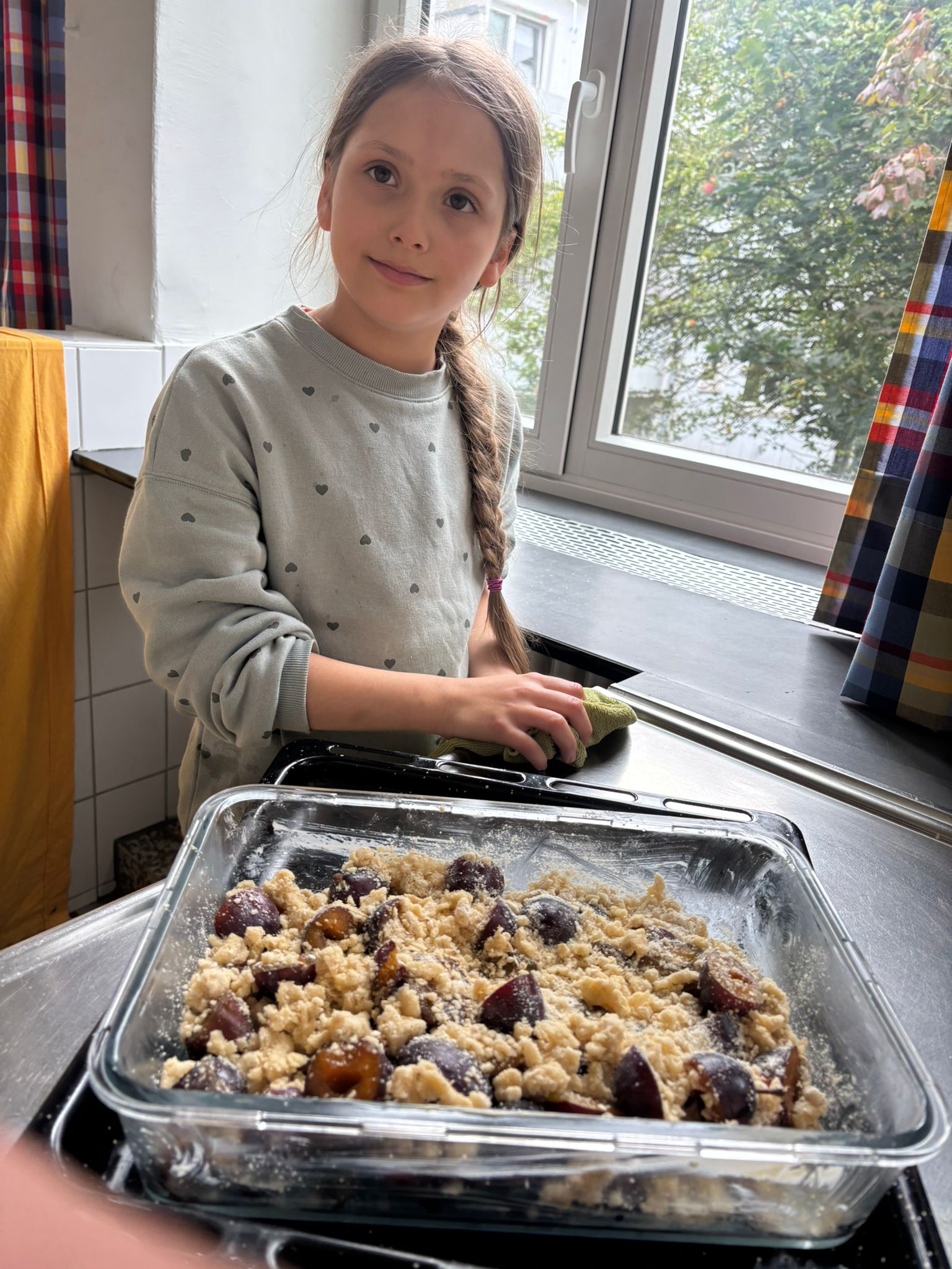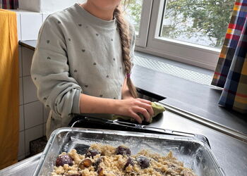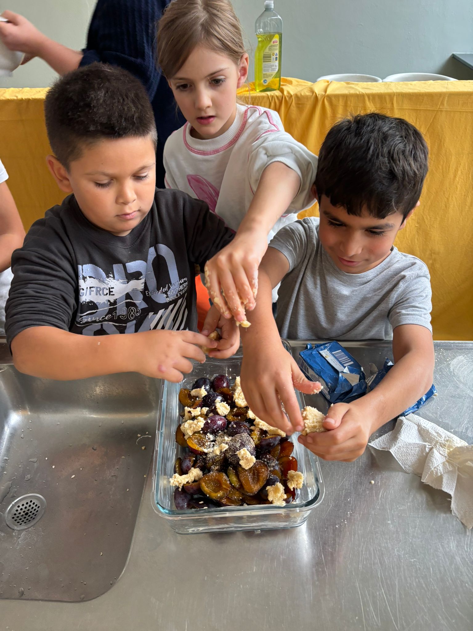 Klasse 3 erntet Obst aus dem Schulgarten und bereitet daraus leckeren Pflaumen-Crumble.